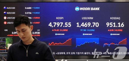 (서울=뉴스1) 이호윤 기자 = 코스피가 연일 사상 최고치를 경신한 15일 서울 중구 우리은행 본점 딜링룸 현황판에 종가가 표시되고 있다. 이날 코스피는 전 거래일 대비 74.45포인트(1.58%)상승한 4,797.55로 코스닥은 8.98(0.95%)상승한 951.16으로 장을 마쳤으며 원·달러 환율은 내림세를 보이고 있다. 2026.1.15/뉴스1