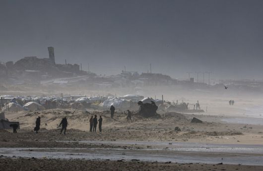 13일(현지시각) 팔레스타인 가자지구에서 해변 주변에 세워진 천막 주변으로 팔레스타인 주민들의 모습이 보인다. 로이터 연합뉴스 |
