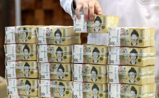 14일 오후 서울 중구 하나은행에서 직원이 5만원권을 정리하고 있다. /뉴스1 |