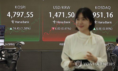 (서울=연합뉴스) 김주형 기자 = 코스피가 열흘 연속 상승하며 4,800대 문턱에서 마감한 15일 서울 중구 하나은행 딜링룸 현황판에 코스피지수가 표시돼 있다.