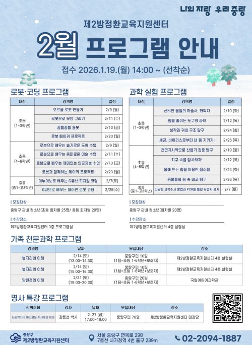 중랑구 제2방정환교육지원센터 ‘2026년 2월 겨울방학 프로그램’ 포스터. 중랑구 제공 |