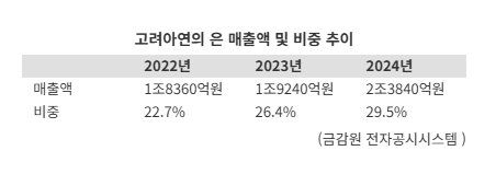 15일 관련 업계에 따르면 고려아연의 지난해 3·4분기까지 은 매출액은 2조3460억원에 달했다. 2024년 전체 은 매출액인 2조3840억원에 육박하는 수치다. 아직 공시는 되지 않았으나 지난해 은 전체 매출액은 3조원에 달할 것이란 예상도 나온다.