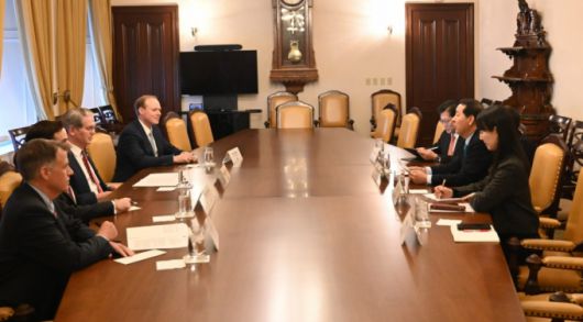 구윤철 부총리 겸 재정경제부 장관(사진 오른쪽에서 두번째)과 스콧 베선트 미국 재무부 장관(사진 왼쪽에서 세번째)이 양자 면담하고 있다 /사진제공=재정경제부 |