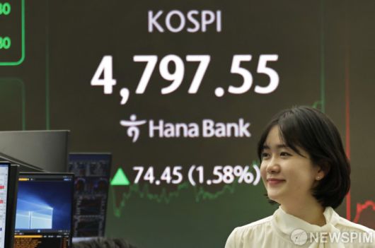 한국거래소에 따르면 이날 코스피 지수는 전 거래일 대비 74.45포인트(1.58%) 오른 4797.55에 거래를 마쳤다. 외국인과 기관이 각각 3089억원, 1조3400억원 어치 순매수했고 개인은 1조8120억원 어치 순매도했다.