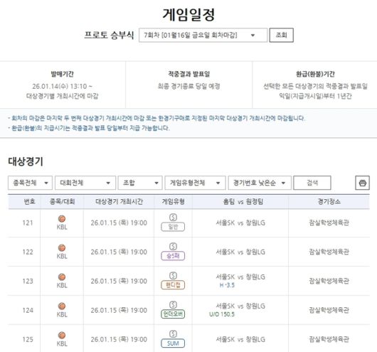 프로토 승부식 7회차 2025-2026 KBL 서울SK(홈)-창원LG(원정)전 대상 경기 게임. 사진 | 한국스포츠레저 |