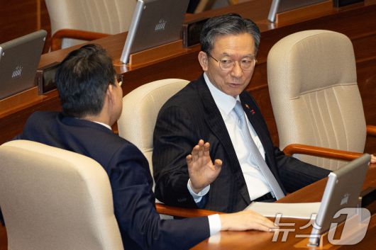 (서울=뉴스1) 유승관 기자 = 정성호 법무부 장관과 윤상현 국민의힘 의원이 15일 서울 여의도 국회에서 열린 제431회 국회(임시회) 제1차 본회의에서 대화하고 있다. 2026.1.15/뉴스1fotogyoo@news1.krCopyright ⓒ 뉴스1. All rights reserved. 무단 전재 및 재배포, AI학습 이용 금지.
