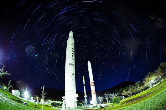 사진은 나로우주센터 우주과학관 로켓광장에 우리나라에서 개발된 1단형 고체추진 로켓 KSR-Ⅰ, 2단형 고체추진로켓 KSR-Ⅱ, 액체추진 과학로켓 KSR-Ⅲ, 우주발사체 KSLV-Ⅰ(나로호)의 실물크기 로켓 모형 뒤로 별의 일주운동 궤적이 보이는 모습. 뉴시스 |