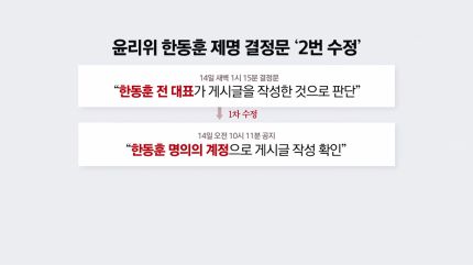 처음 결정문에선 "한 전 대표가 게시글을 작성한 걸로 판단된다"고 썼지만, 약 9시간 뒤엔 "한 전 대표의 직접 작성 여부는 확인이 불가하다"며 "한 전 대표 명의 계정으로 게시글이 작성된 건 확인됐다"고 고쳤습니다.