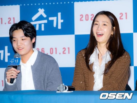 [OSEN=민경훈 기자] 15일 오후 서울 광진구 자양동 롯데시네마 건대입구에서 영화 '슈가' 언론배급시사회가 열렸다. ‘슈가’는 1형 당뇨 판정을 받은 어린 아들을 구하기 위해 고군분투하다 끝내 세상을 바꾸어 버린 한 엄마의 기적 같은 이야기를 그린 휴먼 드라마다. 배우 고동하의 말에 최지우가 기자간담회에서 미소 짓고 있다. 2026.01.15 / rumi@osen.co.kr