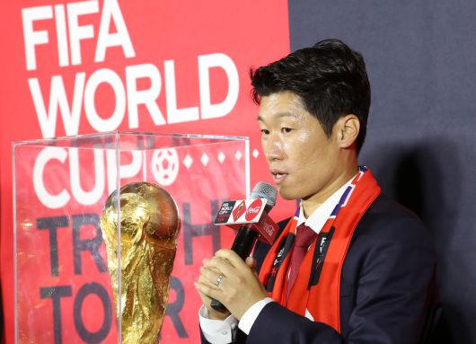 2022년 8월24일 서울 영등포구 여의도 더현대 서울에서 열린 ‘FIFA 월드컵 트로피 투어’ 미디어 행사에서 대한민국 축구 국가대표 출신 박지성씨가 발언하고 있다. 뉴시스 |