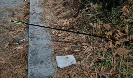 지난 7일 밤 청주에서 산책중인 여성 주변으로 날라와 화단에 박힌 화살. 연합뉴스 |