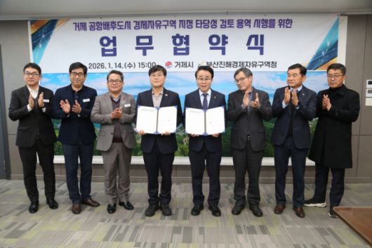부산진해경제자유구역청이 경남 거제시와 '거제 공항배후도시 경제자유구역 지정 타당성 검토 용역' 시행 업무협약을 했다고 15일 밝혔다.