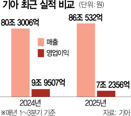 기아는 지난해 글로벌 시장에 313만여 대를 팔며 역대 최대 판매량을 기록했지만 경영 상황은 녹록지 않다. 미국의 관세 부과로 지난해에만 2조 원 이상의 비용을 부담하면서 영업이익이 큰 폭으로 감소했기 때문이다. 기아의 지난해 1~3분기 누적 영업이익은 7조 2356억 원으로 전년 동기 대비 27.2% 급감했다. 지난해 3분기에 발생한 관세 부담만도 1조 2340억 원에 달한다. 노조가 판매량이라는 단순 지표만 앞세워 사측을 압박하고 있는 셈이다.