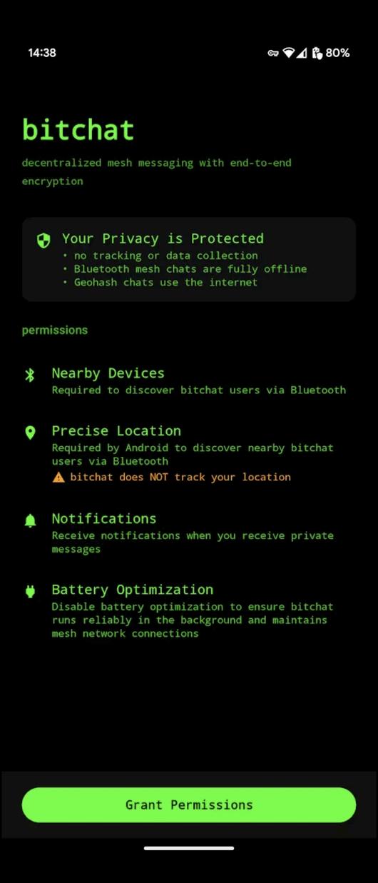비트챗은 트위터 공동 창업자 잭 도시가 지난해 출시한 인터넷이 필요 없는 블루투스 기반 P2P 채팅 앱이다. 로그인이 필요하지 않으며, 한 사람이 메시지를 보내면 인근 휴대전화의 블루투스 기능을 타고 목적지까지 전달된다.