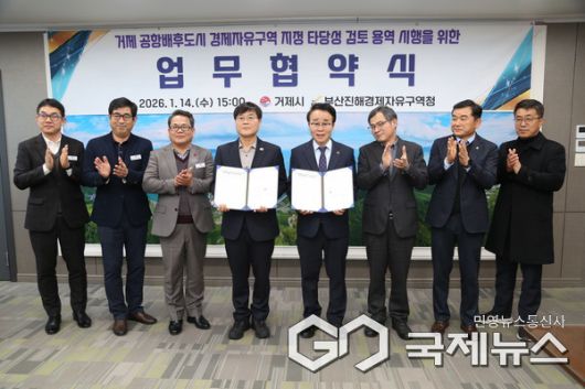 (경남=국제뉴스) 황재윤 기자 = 부산진해경제자유구역청과 경남 거제시가 1월 14일 거제시청에서 '거제 공항배후도시 경제자유구역 지정 타당성 검토 용역' 시행을 위한 업무협약을 체결했다.