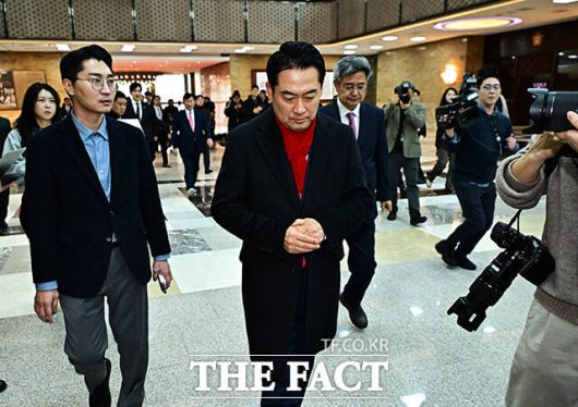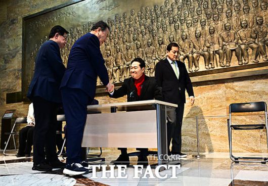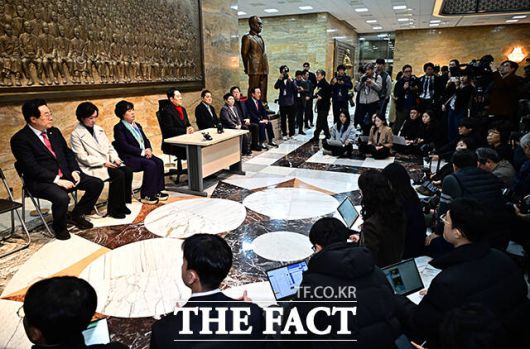 [더팩트ㅣ국회=배정한 기자] 장동혁 국민의힘 대표가 15일 오후 서울 여의도 국회 로텐더홀에서 단식농성을 시작하고 있다.