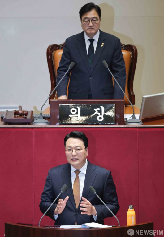 [서울=뉴스핌] 윤창빈 기자 = 천하람 개혁신당 원내대표가 15일 서울 여의도 국회에서 열린 본회의에서 윤석열ㆍ김건희에 의한 내란ㆍ외환 및 국정농단 행위의 진상규명을 위한 특별검사 임명 등에 관한 법률안에 대한 무제한 토론을 하고 있다. 2026.01.15 pangbin@newspim.com