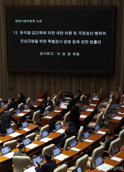 [서울=뉴스핌] 윤창빈 기자 = 15일 서울 여의도 국회에서 열린 본회의에서 윤석열ㆍ김건희에 의한 내란ㆍ외환 및 국정농단 행위의 진상규명을 위한 특별검사 임명 등에 관한 법률안이 상정되고 있다. 2026.01.15 pangbin@newspim.com