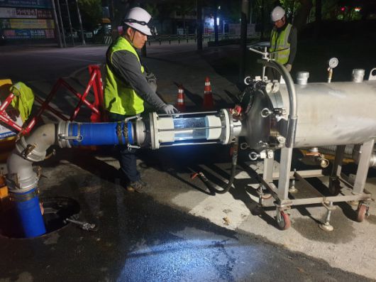경남 거창군 관계자들이 군내 한 도로에서 노후 상수도관 세척작업을 하고 있다. /거창군 |