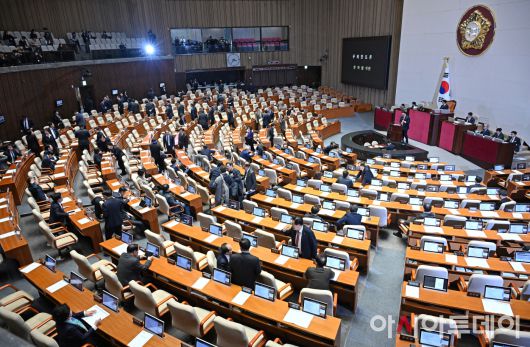 아시아투데이 송의주 기자 = 천하람 개혁신당 의원이 15일 국회에서 열린 본회의에서 윤석열·김건희에 의한 내란·외환 및 국정농단 행위의 진상규명을 위한 특별검사 임명 등에 관한 법률안에 대한 무제한토론(필리버스터)을 하는 가운데 더불어민주당 의원들이 회의장을 나서고 있다. ⓒ "젊은 파워, 모바일 넘버원 아시아투데이"