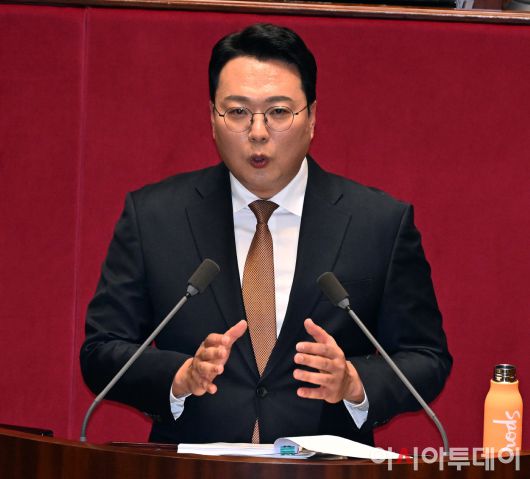 아시아투데이 송의주 기자 = 천하람 개혁신당 의원이 15일 국회에서 열린 본회의에서 윤석열·김건희에 의한 내란·외환 및 국정농단 행위의 진상규명을 위한 특별검사 임명 등에 관한 법률안에 대한 무제한토론(필리버스터)을 하고 있다. ⓒ "젊은 파워, 모바일 넘버원 아시아투데이"