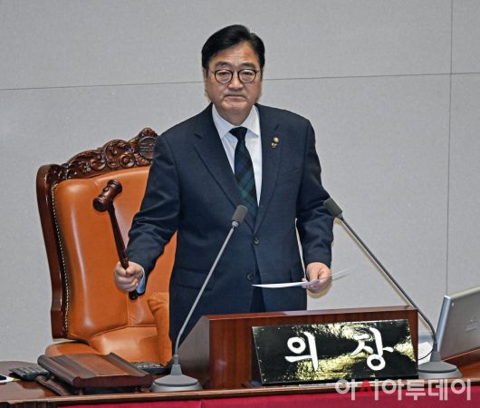 아시아투데이 송의주 기자 = 우원식 국회의장이 15일 국회에서 열린 본회의에서 의사봉을 두드리고 있다.