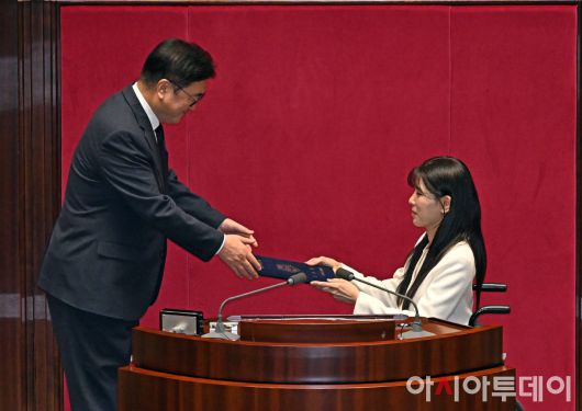 아시아투데이 송의주 기자 = 우원식 국회의장이 15일 국회에서 열린 본회의에서 이소희 국민의힘 의원의 선서문을 의장석에서 내려와 받고 있다. ⓒ "젊은 파워, 모바일 넘버원 아시아투데이"