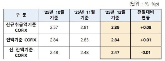 잔액기준 코픽스는 2.84%로 0.01%p 상승했으며 신 잔액기준은 2.47%로 0.01%p 하락했다.