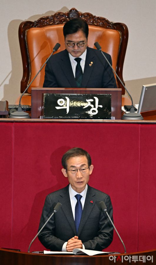 아시아투데이 송의주 기자 = 김호철 감사원장이 15일 국회에서 열린 본회의에서 인사말을 하고 있다.