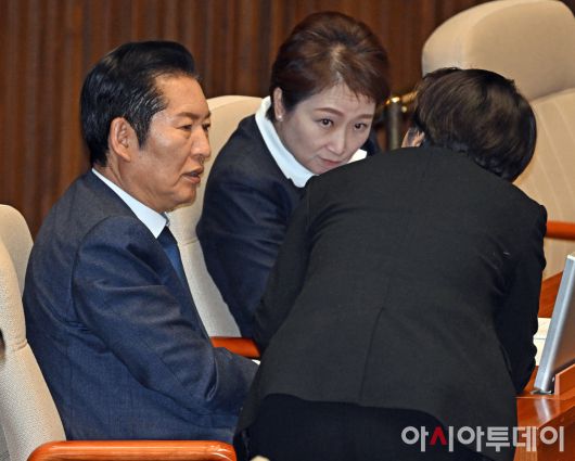 아시아투데이 송의주 기자 = 정청래 더불어민주당 대표(맨 왼쪽)가 15일 국회에서 열린 본회의에서 동료의원들과 이야기를 나누고 있다.