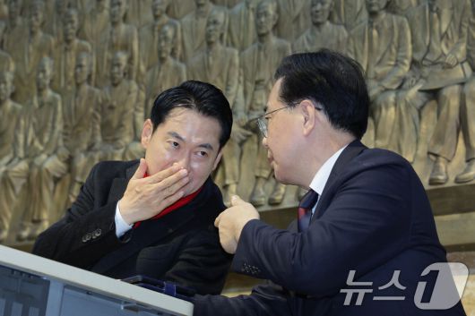 (서울=뉴스1) 신웅수 기자 = 장동혁 국민의힘 대표가 15일 서울 여의도 국회 로텐더홀에서 더불어민주당의 통일교 및 공천뇌물 특검 수용을 촉구하며 단식을 하며 송언석 원내대표와 대화하고 있다. 2026.1.15/뉴스1phonalist@news1.krCopyright ⓒ 뉴스1. All rights reserved. 무단 전재 및 재배포, AI학습 이용 금지.