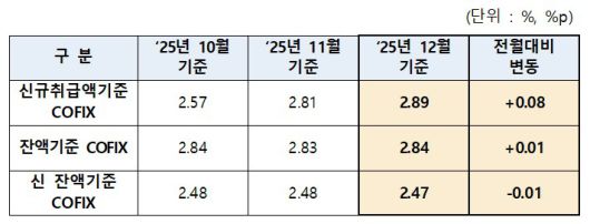 15일 은행연합회는 2025년 12월 신규 취급액 기준 코픽스가 2.89%를 기록하며 전월 대비 0.08%포인트(p) 상승했다고 밝혔다.
