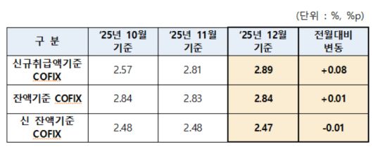 15일 은행연합회에 따르면 지난해 12월 신규 취급액 기준 코픽스는 연 2.89%로, 11월(연 2.81%)보다 0.08%포인트(p) 상승했다. 잔액 기준 코픽스도 같은 기간 2.83%에서 2.84%로 0.01%p 올랐다.