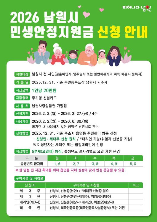 민생경제 회복을 시정 핵심과제로 추진 중인 남원시가 시민의 생활비 부담을 완화하고 침체된 지역 소비를 회복하기 위한 실질적 정책으로 마련한 조치다.