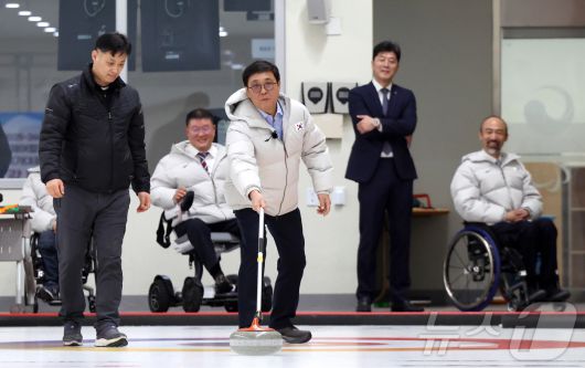(서울=뉴스1) = 최휘영 문화체육관광부 장관이 15일 경기도 이천선수촌에서 열린 장애인 국가대표 훈련개시식에서 컬링 체험을 하고 있다. (문화체육관광부 제공. 재판매 및 DB 금지) 2026.1.15/뉴스1urodoct2@news1.krCopyright ⓒ 뉴스1. All rights reserved. 무단 전재 및 재배포, AI학습 이용 금지.