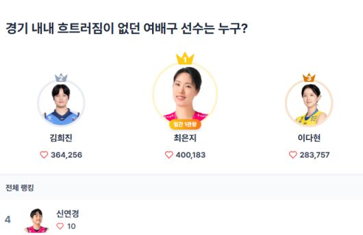2위는 김희진이 차지했다. 36만 표를 넘는 득표수로 최은지와 치열한 상위권 경쟁을 형성했다. 오랜 경험에서 나오는 안정감과 결정력, 그리고 팀을 이끄는 리더십이 여전히 팬들의 신뢰를 받고 있다는 분석이다.