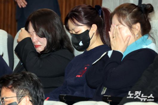 15일 서울 여의도 국회 본회의에서 '항공·철도 사고조사에 관한 법률 일부개정법률안(대안)'이 가결 되자 12.29 제주항공 여객기 참사 유족들이 눈물을 흘리고 있다.