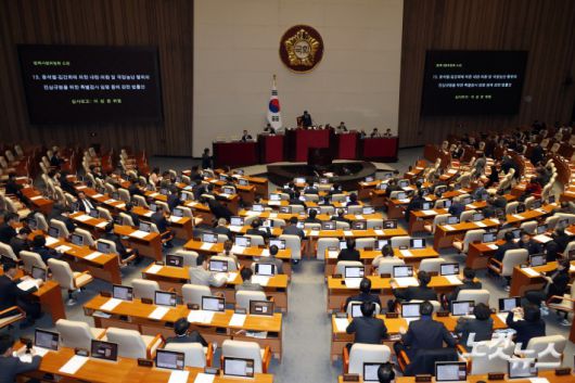 15일 서울 여의도 국회 본회의에 윤석열·김건희에 의한 내란·외환 및 국정농단 행위의 진상규명을 위한 특별검사 임명 등에 관한 법률안이 보고되고 있다.