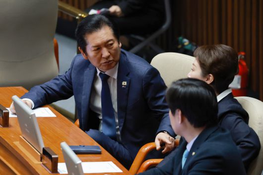 정청래 더불어민주당 대표(왼쪽)가 15일 국회 본회의에서 이언주·황명선 최고위원과 대화하고 있다. 연합뉴스 |