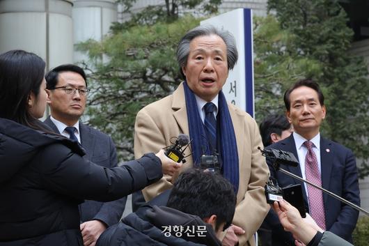 국민건강보험공단이 담배 회사들을 상대로 제기한 손해배상 청구소송 항소심에서 패소한 15일 서울 서초구 서울고법에서 정기석 국민건강보험공단 이사장이 판결 직후 입장을 밝히고 있다. 정효진 기자 |