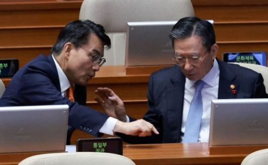 정성호 법무부 장관과 윤상현 국민의힘 의원이 15일 국회에서 열린 본회의에서 대화하고 있다. <ⓒ투자가를 위한 경제콘텐츠 플랫폼, 아시아경제(www.asiae.co.kr) 무단전재 배포금지>