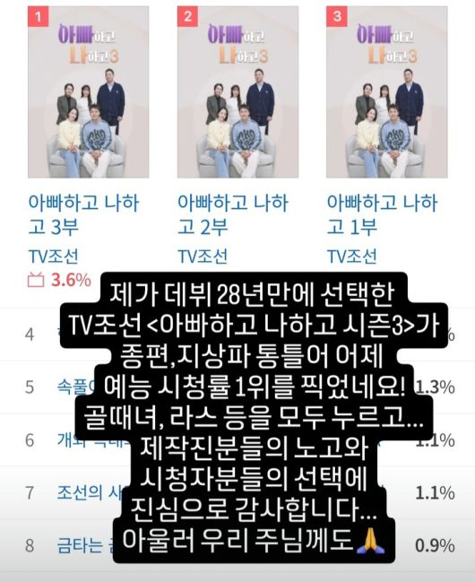 임형주는 15일 개인 SNS를 통해 "데뷔 28년만에 선택한 '아빠하고 나하고 시즌3'가 종편, 지상파 통틀어 어제 예능 시청률 1위를 찍었다"면서 "'골때녀', '라디오스타' 등을 모두 눌렀다"고 기쁨을 드러냈다.