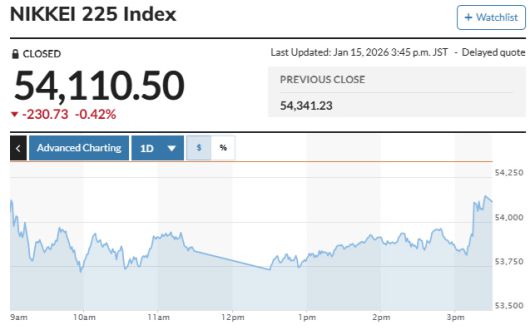 일본증시 닛케이225지수 등락 추이. 15일 종가 5만4110.50. 출처 마켓워치 |