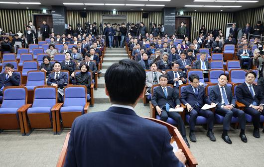 15일 국회에서 열린 더불어민주당 의원총회에서 의원들이 정청래 대표(뒷모습)의 발언을 듣고 있다. 박민규 선임기자 |