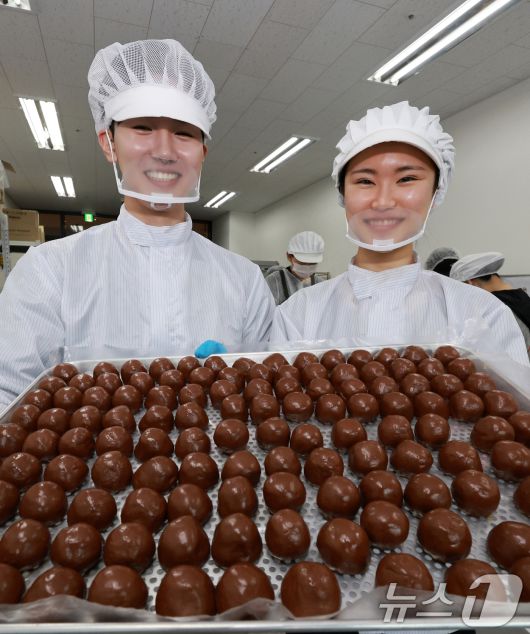 (김포=뉴스1) 이호윤 기자 = 이윤민 아워포지티비티 대표와 김나리 제과장이 15일 경기 김포시 구래동 몬트쿠키 두바이쫀득쿠키(두쫀쿠)제작실에서 두바이쫀득쿠키를 들어보이고 있다. 두바이쫀득쿠키는 이윤민 대표의 아이디어와 김나리 제과장의 베이킹으로 탄생해 대중들의 많은 사랑을 받고 있다. 2026.1.15/뉴스1