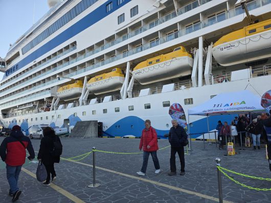 독일 선사 아이다크루즈 사의 6만9000t급 선박 아이다디바호가 지난 12일 부산항 크루즈 터미널에 입항했다. 크루즈 승객들이 하선하고 있다. 부산항만공사 제공 |
