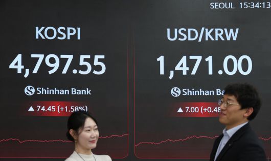 원-달러 환율이 15일 미국 재무 장관의 구두 개입과 한은의 금리동결 결정으로 1470원 밑으로 내려왔다. 코스피는 이날도 거침없이 오르며 열흘째 연속 상승해 4800선 문턱에서 마감했다. ‘오천피’(코스피 5000)까지 불과 202가량 남아, 오천피 카운트다운이 시작됐다는 기대감이 더욱 고조되고 있다.