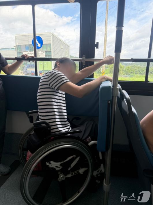김해 저상버스 이용 실태 모니터링에 참여한 장애인 활동가가 휠체어 안전 장치가 지원되지 않는 저상버스를 탑승해 팔로 휠체어를 고정하고 있는 모습.(김해서부장애인인권센터 제공. 재판매 및 DB금지) |