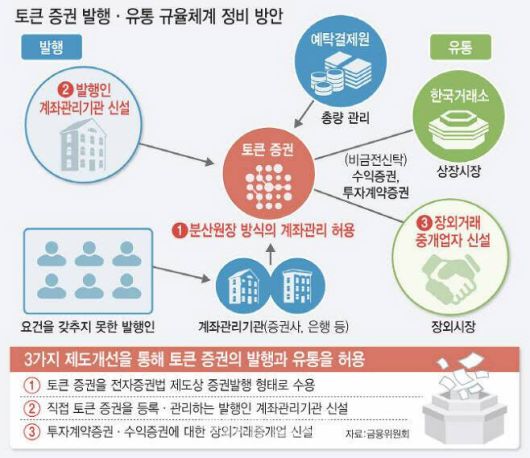 협의체는 금융위 금융감독원 한국예탁결제원 금융투자협회 금융회사 핀테크 기업 학계 전문가 등으로 구성되며 오는 2월 중 첫 회의를 연다. 협의체 안에는 기술·인프라 발행제도 유통제도 등 3개 분과를 두고 세부 제도를 설계할 계획이다.