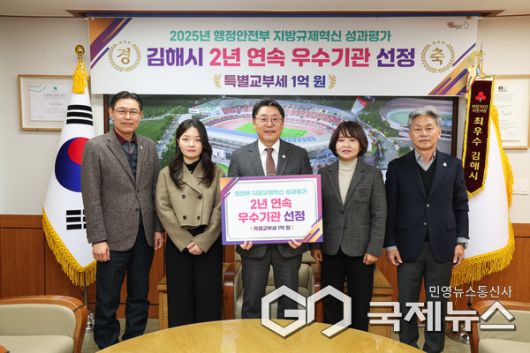 (김해=국제뉴스) 황재윤 기자 = 김해시는 행정안전부 주관 '2025년 지방규제혁신 추진 성과평가'에서 2024년에 이어 2년 연속 우수기관으로 선정돼 특별교부세 1억 원을 확보했다고 15일 밝혔다.